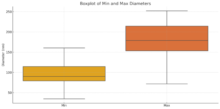 The boxplot in Figure S6 demonstrates a wider spread in maximum diameters (129–241 nm) compared to minimum diameters, reflecting the composite’s anisotropic nature and the coexistence of growth modes inherited from both precursor materials.