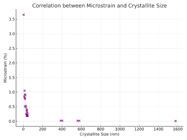 Conversely, crystallites with larger domain sizes (e.g., $>$ 400 nm in the composite) exhibit minimal strain, as evidenced by microstrain values approaching zero (e.g., 0.005–0.02%). These may represent coarsened domains or recrystallized regions formed during the laser-induced agglomeration phase.