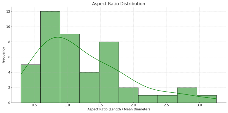 As shown in Table S3, other strong correlations include length vs. aspect ratio (r = 0.977) and mean vs. maximum diameter (r = 0.913). The inverse correlation between mean diameter and aspect ratio (r = -0.408) suggests that more elongated particles tend to be smaller in size. This may be a result of localized growth environments and transient coalescence processes.