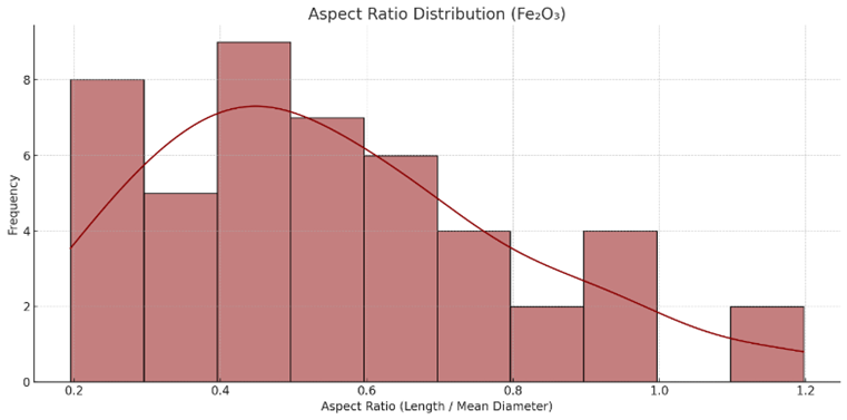 Most Fe$_2$O$_3$ particles exhibit aspect ratios below 1.0, consistent with near-spherical morphologies. The mode is centered around 0.5, indicating isotropic growth behavior.