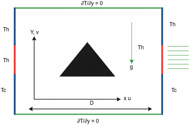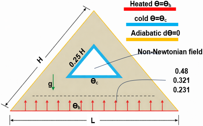 Chatterjee et al. [39] studied NC of a (Al$_2$O$_3$-H$_2$O) in triangular cavity containing an inverted triangular hot obstacle. FEM was used. Parameters used, including Ra (10$^3$–10$^6$) and the size of obstacle. The results showed that the best HTR is achieved at the smallest obstacle size, smaller obstacle size means less obstruction to fluid flow. Roshani et al. [40] studied NC of a (Al$_2$O$_3$-H$_2$O) in a triangular cavity containing obstacles inverted triangle. parameters such as Ra (10$^3$–10$^5$) was studied. This study proved that the obstacle enhanced HT and thus resulted in an increase in the Nu values. The obstacle within the cavity disrupts the streamline, creating local vortices. These vortices move the fluid better near hot and cold surfaces, reducing the thickness of the thermal boundary layer. Yaseen et al. [41] studied NC in triangular enclosure filled with a shear-thinning non-Newtonian fluid, Results showed that increasing Ra intensifies convection and improved ($N \bar{u}$). Lower power-law index (n) values, representing stronger shear-thinning behavior, lead to higher $N \bar{u}$ due to reduced viscosity. The best HT occurred when the obstacle was placed closest to the heated base (B = 0.2 H).