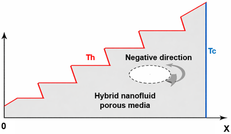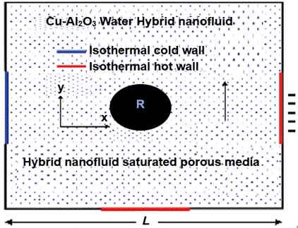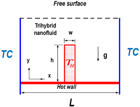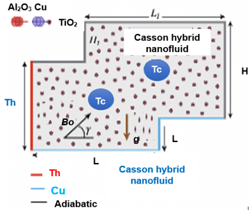 The elements or objects inside cavities helps control HT by providing both passive and active HT, which contributes effectively to many applications in automotive, electronics, aerospace, vacuum and engineering systems [20]. Moukalled and Acharya [21] studied of the effect of a rotating solid body inside a closed cavity, as this body affected the formation of vortices and HT. Nasir et al. [22] tried to control the HTR of a nanofluid by introducing a magnetic field. Dutta et al. [23] found that the magnetic field inhibits HT. Nasir et al. [24] used computational to design a trihybrid nanofluid, show significant superiority in thermal properties compared to conventional fluids.