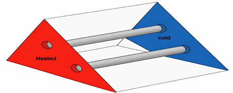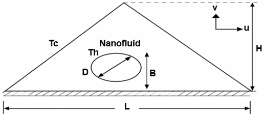 Ghoben and Hussein [44] confirmed that the use of cylinders obstacles inside cavity enhances NC due to the increase in turbulent flow. double aligned cylinders have a negative effect on the Nu, while the best values of the Nu occur when double non-aligned cylinders. The cylindrical obstacles is enhancement and suppression of HT within cavities. The HTR enhances with increasing heat source diameter, as a result of (Increased surface area for heat exchange) and that non-uniform heating gave best a result of (creating more effective gradients of temperature) [45]. The contradiction between the results of studies [44], [45] can be explained by several factors. First, the boundary conditions differ: study [44] employed uniform wall heating, while Jalili et al. [45] used non-uniform (sinusoidal) heating at the base of the cavity, which leads to different heat distribution patterns. Second, the geometric dimensionality varies, as Ghoben and Hussein [44] analyzed a three-dimensional cavity, whereas [45] focused on a two-dimensional one—significantly affecting flow behavior. Third, each study emphasized different characteristics: Ghoben and Hussein [44] examined the impact of obstacle alignment (aligned vs. non-aligned), while Jalili et al. [45] investigated the effect of obstacle number and size. Finally, the variation in heating methods and resulting flow patterns contributes to the differences in temperature fields and thermal performance, as reflected in the Nusselt number outcomes. Belmiloud et al. [46] investigated NC in a triangular cavity with inclined isothermal walls maintained at TC and a thermally insulated base. The cavity contains a cylindrical heat source at temperature TH and diameter D, placed within a nanofluid composed of H$_2$O and TiO$_2$. The study examines the effects of (0.01 $\leq$ $\phi$ $\leq$ 0.050), (10$^3$ $\leq$ Ra $\leq$ 10$^6$) and heat source position (h) on convective HT enhancement. Results indicate that thermal performance improves with increasing Ra, $\phi$, and heat source diameter. These findings suggest significant potential for optimizing thermal management in systems employing nanofluid-filled triangular cavities with embedded heat sources.