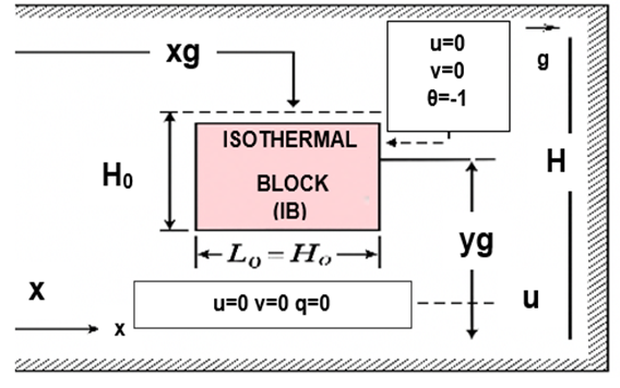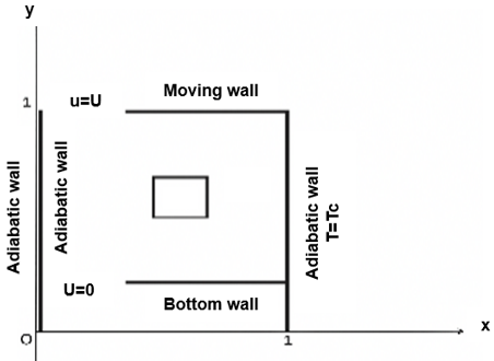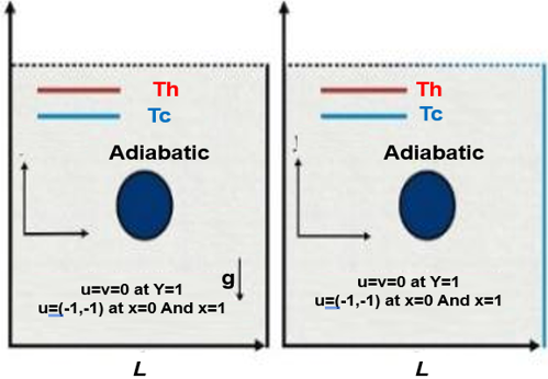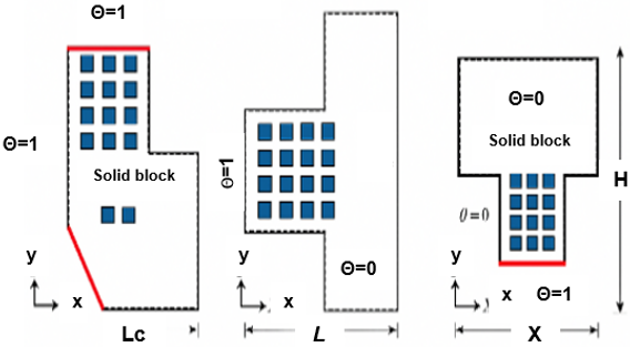 Kalidasan and Kanna [34] studied NC in an L-shaped cavity and the effect of the presence of body inside the cavity filled with a hybrid nanofluid. Mohebbi and Rashidi [35] determined that the greatest HT occurs when the obstacle is located near the lower left corner of the cavity. Bouchoucha et al. [36] explored generation of entropy in cavity with a thick bottom wall and found that increasing the thickness of wall results in a reduction in generation of entropy.
