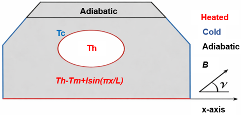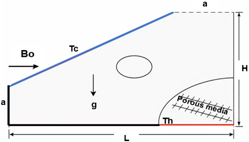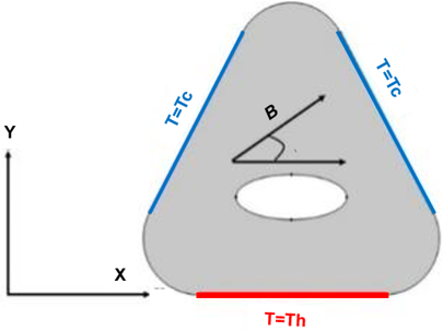 [59] | Shahzad et al | FEM | Viscous Newtonian fluid | $10^{4}\leq Ra \leq 10^{6}$; $0\leq Ha \leq 50$; $Le=0.1$–$10$; $0^\circ\leq \gamma \leq 90^\circ$ | Triangular cavity with central elliptic obstacle. | ![]() |