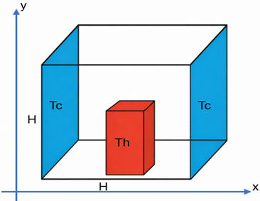 Borahel et al. [62] investigated HT in a rectangular cavity filled with air, containing an isothermal square block placed at different location. The results showed that the block's location significantly affects the flow patterns within the cavity. The study further confirmed that horizontally oriented cavities (low AR) produce higher Nu compared to vertically oriented cavities. Horizontal cavities (low AR) allow better flow circulation, thereby improving HT, whereas vertical cavities (high AR) cause flow confinement, which weakens the convective HT.