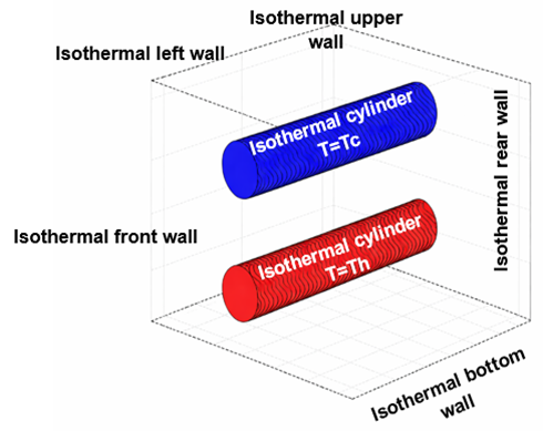 [58] | Spizzichino et al. | FVM | Air | $10^{4}\leq Ra \leq 10^{6}$ | Cubic cavity with two horizontal cylinders. | ![]() |