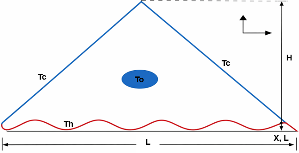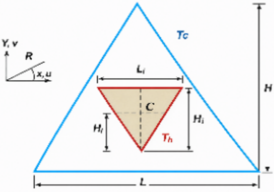 [41] | Yaseen et al. | LBM | Non-Newtonian fluid | $10^{2}\leq Ra \leq 10^{4}$; Obstacle position $(B)$: $0.2H$, $0.3H$, $0.4H$ | Triangular cavity with triangular obstacle. | ![]() |