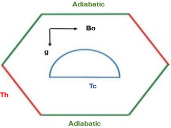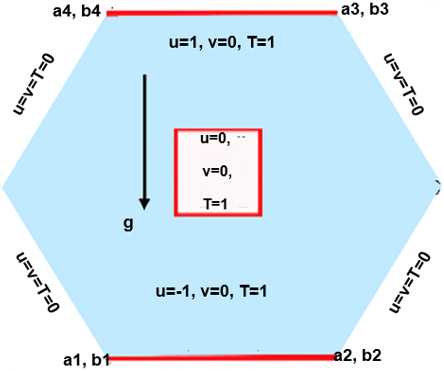 [57] | Shirin | FEM | Air | $10^{3}\leq Ra \leq 10^{6}$; $Ha=0$ | Hexagonal cavity with a semi-circular cold obstacle at center. | ![]() |