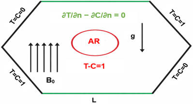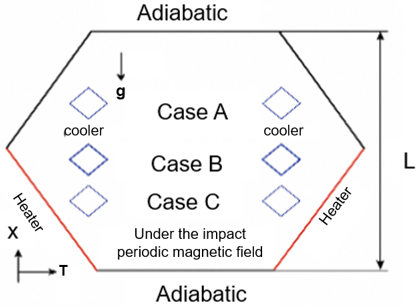 [53] | Majeed et al. | FEM | Casson fluid | $0\leq Ha \leq 100$; $AR=0.10$–$0.20$; $\beta=1$–$10$; $Le=1$–$10$; $0^\circ\leq \gamma \leq 90^\circ$ | Hexagonal cavity with central heated circular obstacle. | ![]() |