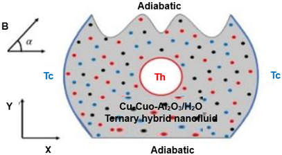 Bilal et al. [50] presented analysis of HT within a crown-shaped wavy cavity containing a centrally located heated circular obstacle, utilizing a (cu-cuo-Al$_2$O$_3$-H$_2$O). The effects of the obstacle’s radius, ($\phi$), Ra, and Ha under an inclined magnetic field were investigated. The results showed that increasing both the obstacle size and the ($\phi$) significantly improved HTR, leading to an enhancement in the average Nu. In contrast, increasing the Ha suppressed fluid motion and reduced the efficiency of convective HT.
