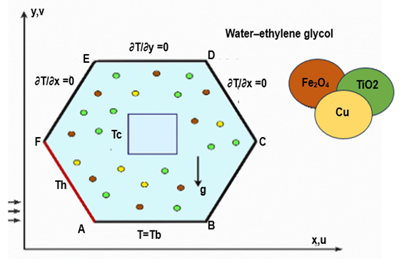 Thilagavathi and Prasad [61] studied NC in a hexagonal cavity containing a cold square obstacle. The cavity is exposed to a magnetic field and filled with (Fe$_3$O$_4$ + TiO$_2$ + Cu-H$_2$O). The result of this study is that the presence of a cold obstacle enhances HT and increases the Nu. As the Ha increases, the Lorentz force is generated, weakening convection and shifting toward conduction-dominated HT.