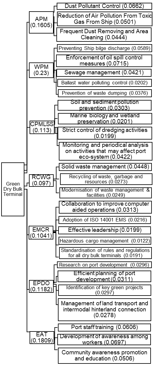 Based on the overall judgments presented in Table 3, the cluster with the highest weightage is WPM with a score of 0.23, followed by Environmental Awareness and Training (EAT) with a score of 0.1809. Air Pollution Management (APM) cluster with 0.1605 points lies third in the ranking. These three clusters presented 57.14% of the total weightage in achieving a green port status, which can be considered as worthy to be given serious consideration due to the limited resources that may be experienced by some of the dry bulk terminals. Eight of the top ten determinants also come from these three clusters. Other clusters involved are Conservation and Preservation of Marine Life, Soil & Sediment (CPMLSS), Recycling of Solid Waste and Garbage (RSWG), Effective Management, Cooperation and Regulations (EMCR), and Efficient Port Development and Operations (EPDO).