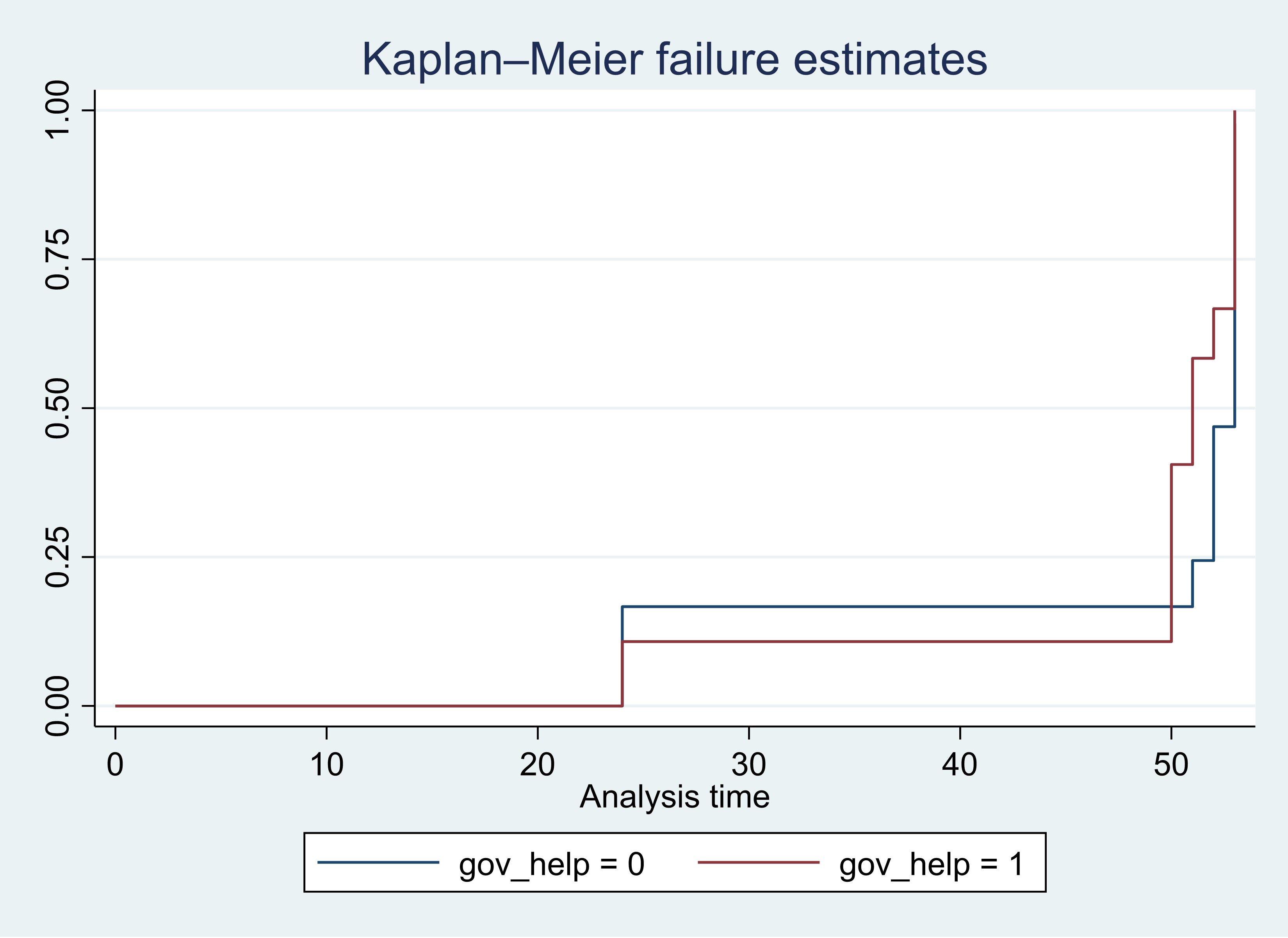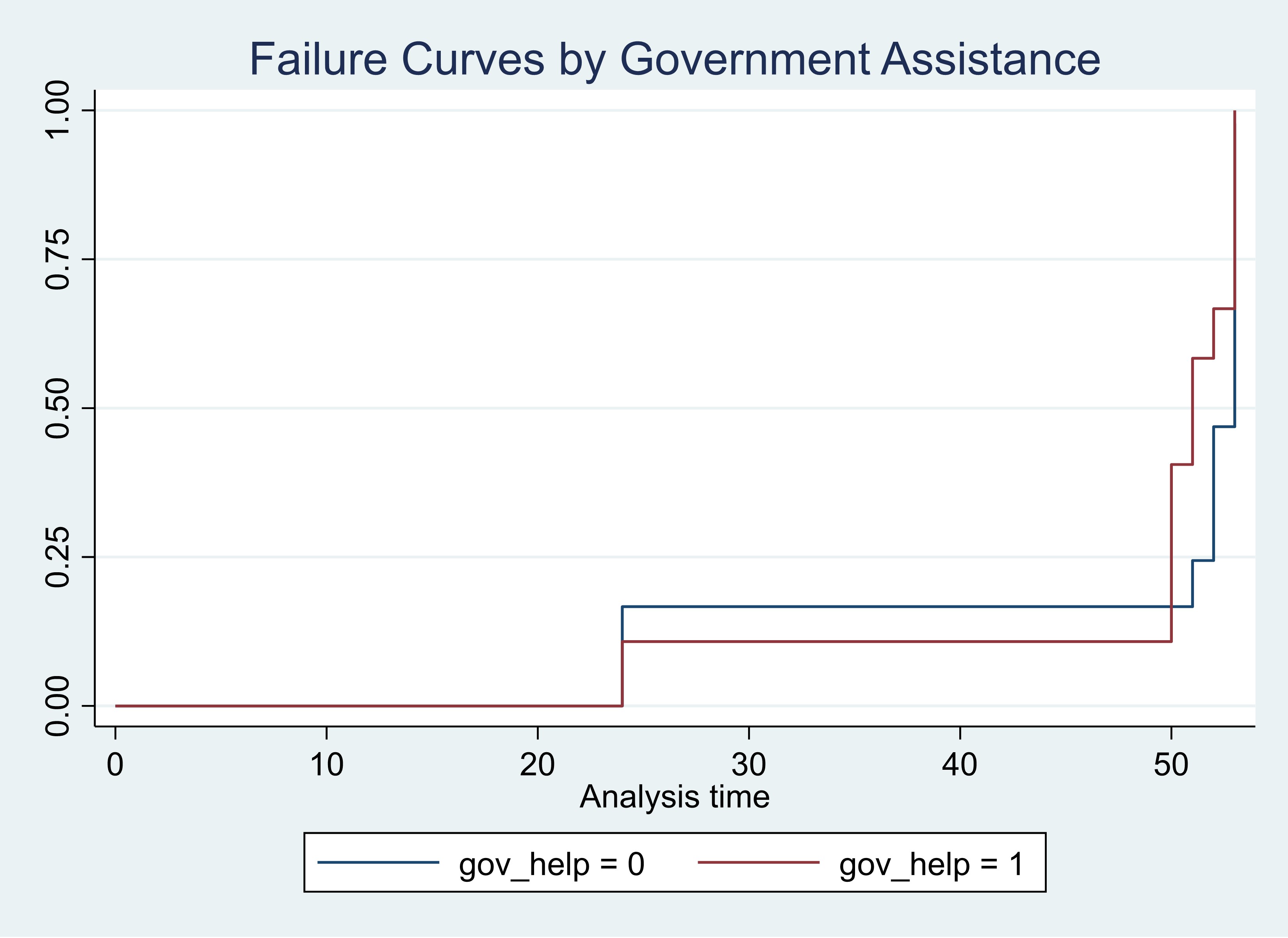 The analysis begins with non-parametric Kaplan-Meier estimation to visualize and compare survival probabilities—representing the probability of not having recovered income—across different vendor groups (Klein & Moeschberger, 2003). Specifically, Kaplan-Meier curves distinguish between vendors receiving different forms of government assistance, providing initial insights into relative recovery speeds and stability. The log-rank test assesses statistical significance between groups, serving as precursor to multivariate modeling by highlighting disparities in recovery trajectories (Cleves et al., 2008).